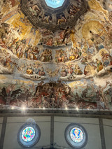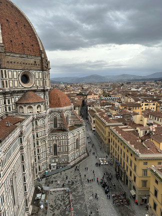 Today we went on an adventure to Florence. We traveled by train; the trains in Italy are much nicer than the ones I've been on in NJ. The seats were so comfortable, and I even got a box with food and water. In Florence, we climbed up a bell tower and the Duomo. The climb up was so difficult; I walked up over 800 steps, and it was steep at times. I felt like I should just go back down and give up, but I didn't. In the end, it was so worth it, being able to see the views from the top, and I felt so proud of myself that I actually did it. We then went and had a quick lunch at a local shop and then went to Ponte Vecchio. It was raining, and it was so windy that my umbrella ended up breaking as well. Even though the weather was horrible, I had an amazing time seeing all of these places.